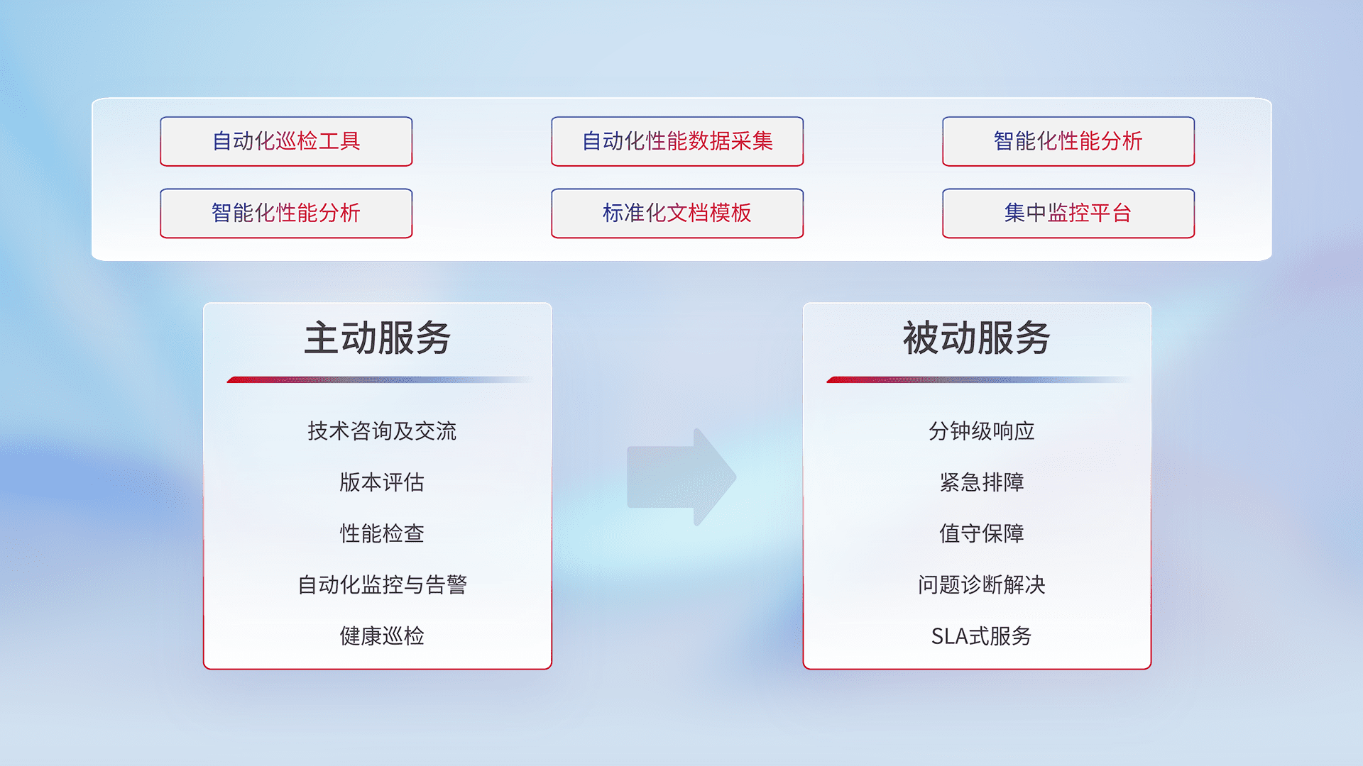 智能化工具和标准化文档,,,保障服务质量,,,提供主动服务(包含技术咨询、、、版本评估、、、、性能检查、、自动化监控与告警、、、、健康巡检)和被动服务包含(分钟级响应、、紧急排障、、、值守保障、、、、问题诊断解决、、、SLA服务)。。。